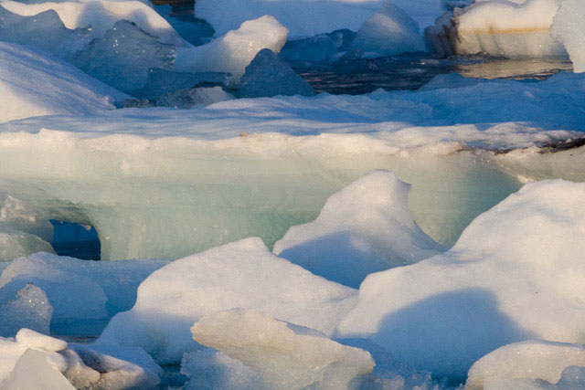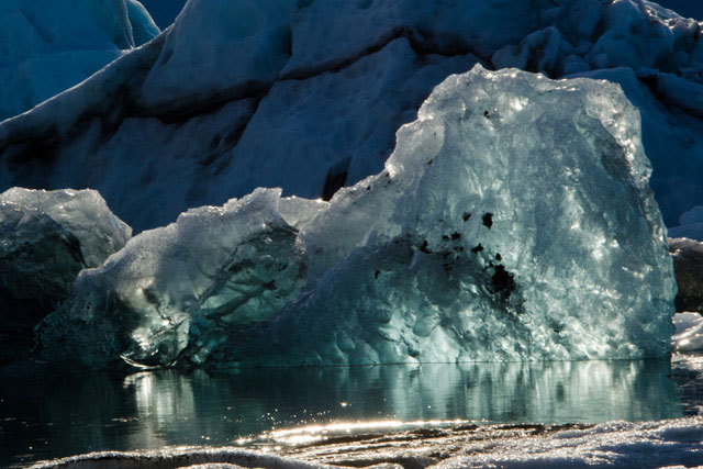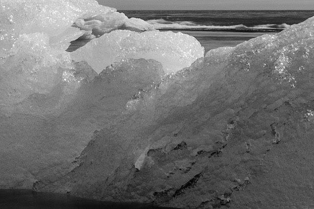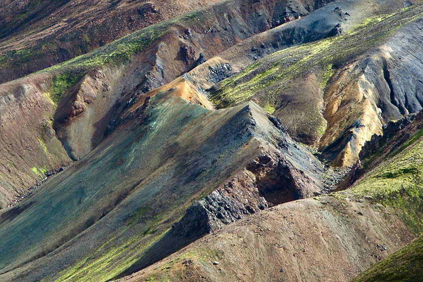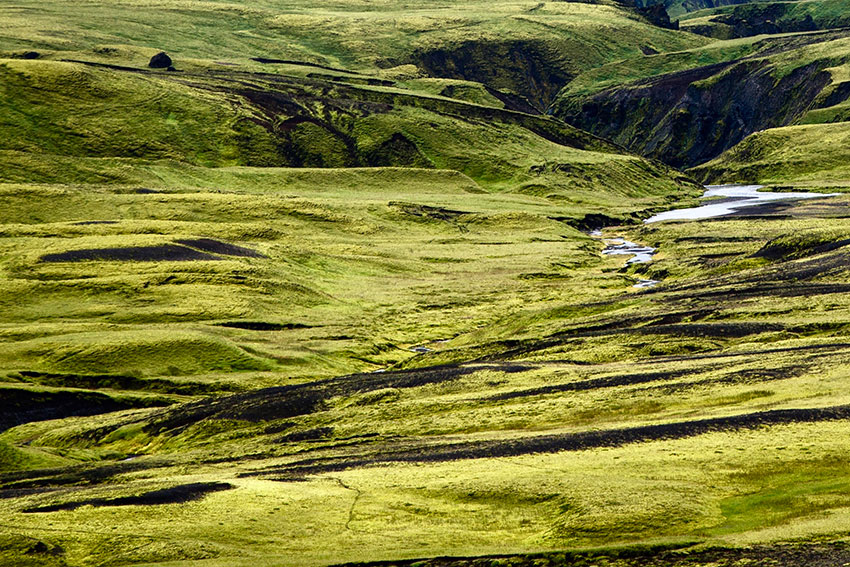 Detailaufnahmen von Gesteinen und Eisformationen, der vielfältige Kontrast von tiefschwarzen oder mit leuchtendem Moos überzogenen Lavafeldern sowie weiß-blau glitzernden Gletscherlagunen erscheinen als abstrakte Strukturstudien, sie entfalten – im Grenzbereich zwischen Fotografie und Malerei – einen geheimnisvollen ästhetischen Reiz.